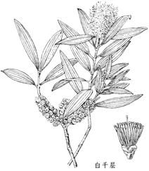 白千层Melaleuca leucadendron L. [Myrtus leucadendra Linn.]又名:王树《中国药用植物图鉴》,白树《广西药用植物名录》?乔木,高达18m?树皮灰白色,厚而松软,呈薄层状剥落?嫩枝灰白色?叶互生;叶柄极短;叶片革质,披针形或狭长圆形,长4~10cm,宽1~2cm,两端尖,全缘,油腺点多,香气浓郁;基出脉3~7条?花白色,密集于枝顶成穗状花序,花序轴常有短毛;萼管卵形,长3mm,有毛或无毛,萼齿5,圆形,长约1mm;花瓣5,卵形,长2~3mm,宽3mm;雄蕊多数,绿白色,长约1cm,常5~8枚成束,花药背部着生,药室平行,纵裂;子房下位,与萼管合生,先端突出,3室,花柱线形,比雄蕊略长,柱头多少扩大?蒴果近球形,直径5~7mm,种子近三角形?花期每年多次?百千层生于较干的沙地上,多为栽培?福建?台湾?广东?海南?广西等地均有栽培?原产澳大利亚?