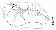 2.长毛对虾在外形、体色和大小等方面,均与中国对虾比较相似。但额角上缘7-8齿,下缘4-6齿。额角侧沟浅,向后更浅,至胃上刺下方消失。额角后脊伸至头胸甲后缘附近,上有1-2个浅凹。额角基部稍高,背部较凸,末端较细,第1触角上鞭与头胸甲长度约相等或稍短。雄体交接器呈叶片状,叶尖变圆,边缘具刚毛,两侧向腹面卷曲。雌体交接器圆盘状,前片的顶端疣突较小,尾节呈刺状,背面中央具一纵沟,两侧边缘的后半部有刚毛。雌性比雄性个体大。体呈灰蓝色,头部前端多蓝点。 栖息于水深25-40m以内的泥沙质海底,幼虾常群集于河口附近或内海中生活。5月性腺成熟,7-8月仔虾已符合商品标准,12月至翌年1月为越冬期。我国分布于浙江舟山以南东海、南海沿海。现为南方人工养殖的主要品种。