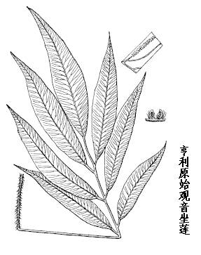亨利原始观音坐莲是陆生中型蕨类植物。具肉质近直立的根状茎,直径2-3cm根肉质而长,粗壮,除顶端略有鳞片外,其余均光滑。叶簇生;叶柄长40-60cm,粗约2.5mm,有宿存的棕色或深棕色狭披针形鳞片;叶一回羽状,草质,有羽片2-4对,先端1枚同形而较大,长可达30cm,宽达6.5cm;侧生羽片互生,有柄,彼此分开约5-6cm,斜出,基部1对稍短,长12-15cm,宽约3cm,上面1对长约17-20cm,宽4-5cm,宽披针形,全缘或略为波状;羽柄长约1cm,膨大,有鳞片。叶脉细而疏生,多分叉或分叉脉与单脉相间。孢子囊群线形,长10-20mm,被等宽的间隙分开,由60-160个孢子囊组成,位于中肋与叶边之间,密生长过于孢子囊群的红褐色节状分叉夹丝。 生于海拔100-300m的山地林下。分布于云南东南部。 |