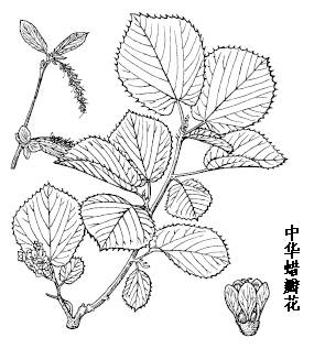 蜡瓣花根为金缕梅科植物中华蜡瓣花的根或根皮。 中华蜡瓣花是落叶灌木或小乔木,高2-5m。嫩枝有柔毛。叶互生;叶柄长1-1.5cm,密生柔毛;托叶窄长形,长约2cm,略有毛;叶薄革质,卵形或倒卵状椭圆形,长4-9cm,宽3-6.5cm,先端短尖,基部心形或斜心形,边缘有锐锯齿,上面绿色,下面灰绿色,具星状毛,或仅脉上有毛,侧脉7-9对,叶脉直达齿尖,齿尖刺毛状。总状花序长3-4cm,下垂,花先叶开放,淡黄色,有香气;花两性,各花基部有一卵形苞片,长约5mm;萼筒具星状毛,萼齿5,卵形,无毛;花瓣5,匙形,长5-6mm,宽约4mm;雄蕊5,长4-5mm,退化雄蕊2裂;子房半下位,具星状毛,2室,花柱2,基部有毛。蒴果卵圆形,熟时开裂为4瓣。种子2,长椭圆形,长5mm,黑色有光泽。