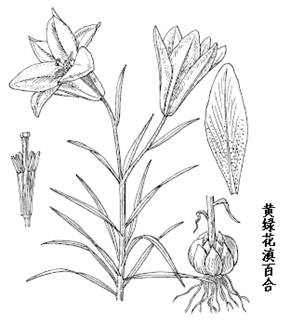 黄绿花滇百合为多年生草本,茎高60-90cm。茎上有小乳头状突起。鳞片卵形或卵状披针形,长达2cm,直径约1cm,白色。叶散生于茎的中上部;叶片条形或条状披针形,长4-7.5cm,宽4-7mm,边缘及下面沿中脉有乳头状突起。花1-3朵,钟状,直立或倾斜,黄绿色或橄榄绿色至淡绿色,内具红紫色或鲜红色斑点;外轮花被片披针形,内轮花被片较宽,呈倒披针形或倒披针状匙形;花丝钻状;子房圆柱形,柱头近球形,3裂。蒴果长圆形。花期7月。 生于山坡林下。分布于四川、贵州、云南。 |
