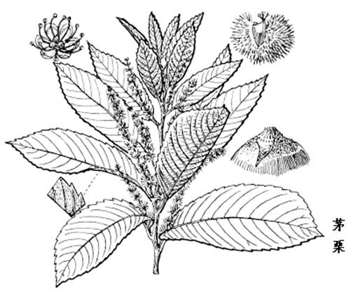 茅栗是落叶灌木或小乔木。幼枝被柔毛,芽卵形,长2-3mm。叶互生;叶柄长0.6-1cm,有短毛;叶片薄革质,长椭圆形或倒卵状长椭圆形,长6-14cm,宽3-7cm,先端渐尖,基部楔形、圆钝或略近心形,常一侧偏斜,边缘具短刺状小锯齿,羽状侧脉12-17对,上面光亮,脉上有毛,下面褐黄色,具鳞状腺点。花单性,雌雄同株;雄花序穗状,单生于新枝叶腋,直立,长6-7cm,单被花,雄蕊10-14;雌花生于雄花序下部,通常三花聚生,子房下位,6室。总苞近球形,直径3-4cm,外面生细长尖刺,刺长4-5.5mm,密生,每壳斗有3-7个坚果,常为3个;坚果扁球形,直径1-1.5cm,褐色。花期5月,果期9-10月。 喜光,耐干旱瘠薄,均系野生,常生于海拔2000m以下的低山丘陵向阳灌丛中。分布于华东、中南、西南及山西、陕西、台湾等地。 |