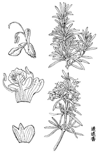迷迭香为唇形科植物迷迭香的全草。 迷迭香是灌木,高达2m。茎及老枝圆柱形,皮层暗灰色,不规则的纵裂,块状剥落,幼枝四棱形,密被白色星状细绒毛。叶常在枝上丛生;具极短的柄或无柄;叶片草质,线形,长1-1.2cm,宽1-2mm,先端钝,基部渐狭,全缘,向背面卷曲,上面稍具光泽,近无毛,下面密被白色的星状绒毛。花近无梗,对生,少数聚集在短枝的顶端组成总状花序;苞片小,具柄;花萼卵状钟形,长约4mm,外面密被白色星状绒毛及腺体,内面无毛,11脉,二唇形,上唇近圆形,全缘或具很短的3齿,下唇2齿,齿卵圆状三角形;花冠蓝紫色,长不及1cm,外被疏短柔毛,内面无毛,冠筒稍外伸,冠檐二唇形,上唇直伸,2浅裂,裂片卵圆形,下唇宽大,3裂,中裂片最大,内凹,下倾,边缘为齿状,基部缢缩成柄,侧裂片长圆形;雄蕊2枚发育,着生于花冠下唇的下方,花丝中部有1向下的小齿,药室平行,仅1室能育;花柱细长,远超过雄蕊,先端不相等2浅裂,裂片钻形,后裂片短;花盘平顶,具相等的裂片;子房裂片与花盘裂片互生。花期11月。 原产于欧洲及非洲地中海沿岸。我国引种栽培于园圃中。 |