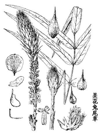 美花兔尾草是多年生半灌木,高30-60cm。茎枝粗,稍有分枝,被白色短柔毛。奇数羽状复叶;小叶5-7,叶片线状披外形,长6-12cm,宽1-2cm,先端渐尖,基部浑圆,两面中脉被毛,下面较密。总状花序顶生,长圆筒状,长15-30cm,直径约4cm;花密集;苞片棕黄色,披针形,长约2.5cm,密生长柔毛,脱落;萼浅杯状,萼齿5,狭披针形,上面2齿较短,密生白色长毛,毛的基部膨大,下面3齿线形,长为上部2齿的2倍,花冠蓝紫色,稍长于萼,旗瓣圆形,长约6-8mm,基部具短爪,翼瓣耳形,较短,龙骨瓣与翼瓣等长,弯曲;雄蕊二体;子房无柄,花柱弯曲。荚果银灰色,3-5节,长约5mm,无毛,每节有种子1颗。种子肾形,黄色,长约2mm。花期10月,果期12月。