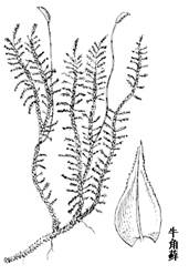 牛角藓是植物体丛生,绿色或黄绿色,无光泽。茎倾立,羽状分枝,分枝短,先端常弯曲;茎枝密被鳞毛。叶疏生;叶片披针形或近三角形,上部有些偏斜,下部两耳部有下延的长尖;叶缘具细齿;中肋粗壮,长达叶尖。叶细胞壁薄,长六角形或呈圆多边形;角细胞薄壁,长方形或方形,褐色,大于叶片其他部位的细胞。雌雄异株。蒴柄长,较粗壮,红色或红褐色;孢蒴倾出或平列,长圆柱形;蒴齿2层。 生于山地的草地上或林缘土上。分布于东北及河北、山西、陕西、河南、云南、西藏等地。 |