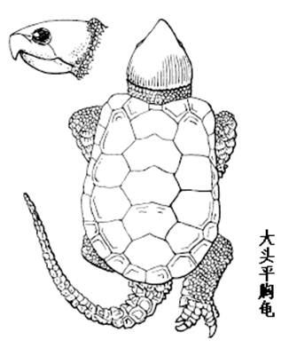 大头平胸龟的背甲长65-156mm,宽55-113mm,壳高34-57mm。头大,颈短,不能缩入壳内,头背覆以大块角质盾片,颌粗大,显著钩曲呈鹰嘴状,背甲长椭圆形,前缘中部凹入,脊部扁平,有一纵棱,颈盾极短小而宽,腹甲略近长方形,前缘平切,后缘凹入;具下缘盾。指、趾端具蹼,有爪。股后及肛侧有锥状鳞,尾甚长,具呈环状排列的长方形鳞片。背面棕黑色,多有浅橘黄色细点,椎盾有辐射状黑纹,每一肋盾有一小黑斑,腹甲橄榄绿,幼体脊棱明显,缘盾第8枚起呈锯齿状,背甲灰绿、棕褐或红棕,腹面橘红色。 生活于山溪中,能爬到树上或岩壁觅食。食螺、鱼、蠕虫等。分布于江苏、安徽、浙江、江西、福建、湖南、广东、广西、贵州、云南等地。 |