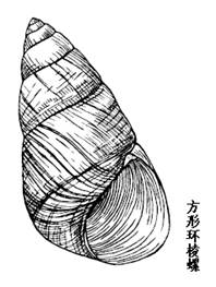 方形环棱螺的贝壳中等大小,全体呈长圆锥形。壳质厚,极坚固。壳高26-30mm,壳宽14-17mm。壳顶尖,螺层7层,缝合线深,体螺层略大,壳面黄褐色或深褐色,有明显的生长线及较粗的螺棱。壳口卵圆形,边缘完整。靥角质,黄褐色,卵圆形,其上有同心环状的生长纹。 |