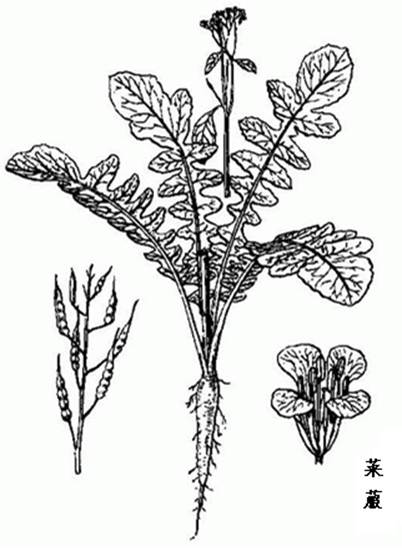 莱菔 二年生或一年生草本,高30-100cm。直根,肉质,长圆形、球形或圆锥形,外皮绿色、白色或红色。茎有分枝,无毛,稍具粉霜。基生叶和下部茎生叶大头羽状半裂,长8-30cm,宽3-5cm,顶裂片卵形,侧裂片4-6对,长圆形,有钝齿,疏生粗毛;上部叶长圆形,有锯齿或近全缘。总状花序项生或腋生;萼片长圆形;花瓣4,白色、紫色或粉红色,直径1.5-2cm,倒卵形,长1-1.5mm,具紫纹,下部有长5mm的爪;雄蕊6,4长2短;雌蕊1,子房钻状,柱头柱状。长角果圆柱形,长3-6cm,在种子间处缢缩,形成海绵质横隔,先端有喙长1-1.5mm;种子1-6颗,卵形,微扁,长约3mm,红棕色,并有细网纹。花期4-5月,果期5-6月。 |