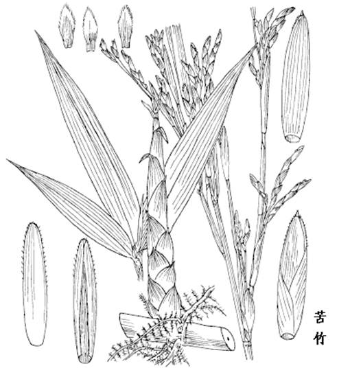 苦竹的植株呈小乔木或灌木状。竿直立,高3-5m,粗1.5-2cm,竿壁厚约6mm。幼竿淡绿色,具白粉,老时绿黄色,被灰白色粉斑;竿散生或丛生,圆筒形,竿环很隆起;每节有3-7分枝,但在每分枝一侧的节间下部1/4处稍平,鞘环有1圈褐色箨鞘基部残留物,箨鞘厚纸质和革质,绿色,无或有细小的紫色斑点,有棕色或白色小刺毛,基部与竿相连处较密,内面光滑而有光泽,边缘密被金黄色的纤毛;箨耳很小,深褐色,有直立棕色毛;箨舌截平,长1-2mm,边缘密生纤毛;箨叶细长披针形,幼时绿色,多脉,无显著的中脉;叶鞘无毛,有横脉;叶舌质坚硬,截平,长0.5-2mm;叶片披针形,长8-20cm,宽5-28mm,质坚韧,表面深绿色,背面淡绿色,有微毛,尤以基部为甚;叶柄长2-7mm。花枝基部有苞片,花序分枝与小穗柄略扁平,常呈波状曲折,小穗绿色,小穗有8-12小花,长4-6cm,绿色或淡紫色,小穗轴间长4-5mm,在杯状顶端有纤毛;颖3-5,有锐尖头,边缘有纤毛;外稃披针形,近革质,有横脉,边缘粗糙,内稃背部2脊间有沟纹,鳞被3,后方1片长于前方2片;雄蕊3,有细长而互相分离的花丝,花药黄色,药隔不伸出;花柱1,柱头3,羽毛状。颖果长圆形。花期4-5月。 |