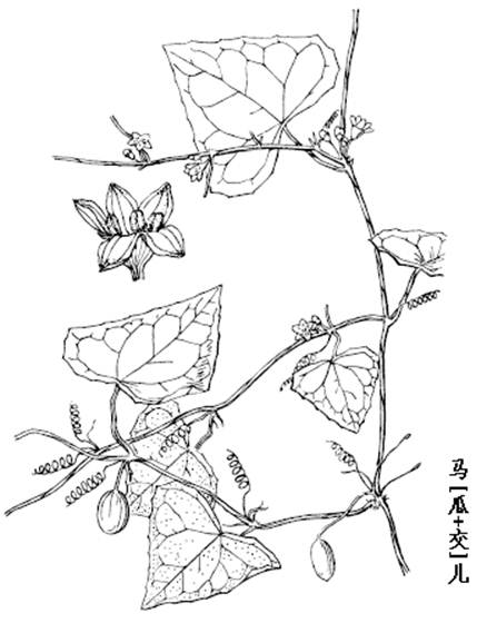 块根呈薯状,表面土黄色至棕黄色。切面粉白色至黄白色,粉性;质坚脆,易折断。茎纤细扭曲,暗绿色或灰白色,有细纵棱。卷须细丝状。单叶互生,皱缩,卷曲,多破碎,完整叶呈三角状卵形或心形,上表面绿色,密布灰白色小凸点,下表面灰绿色,叶脉明显。气微,味微涩。 马[瓜+交]儿 攀缘或平卧草本。块根薯状。茎枝纤细,有棱沟,无毛。卷须不分枝。叶柄细,长2.5-3.5cm;叶片膜质,多型,三角状卵形、卵状心形或戟形,不分裂或3-5浅裂,长3-5cm,宽2-4cm,上面深绿色,脉有上极短的柔毛,背面淡绿色,无毛,先端渐尖或稀短渐尖,基部弯缺半圆形,边缘微波状或有疏齿,脉掌状。雌雄同株;雄花单生或稀2-3朵生于短的总状花序上,花序梗纤细,极短,花梗丝状,花萼宽钟形,萼齿5,花冠5裂,淡黄色,有极短的柔毛,雄蕊3,2枚2室,1枚1室,有时全部2室;雌花在与雄花同一叶腋内单生或双生,子房狭卵形,有疣状凸起,花柱短,柱头3裂,退化雄蕊腺体状。果实长圆形或狭卵形,两端钝,外面无毛,长1-1.5cm,宽0.5-0.8cm,成熟后橘红色或红色。种子灰白色,卵形,基部稍变狭,边缘不明显。花期4-7月,果期7-10月。 |
