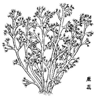 石蕊为石蕊科植物鹿蕊的枝状体。 它的地衣体子器柄圆柱形,长5-10cm,具不等长多叉分枝,表面灰白色,粗糙,枝腋有小穿孔。子器顶生,半球形,暗褐色或黑褐色,干时脆硬,湿时柔软。