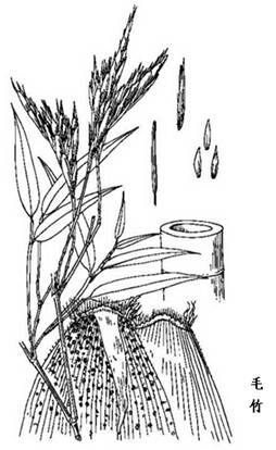 毛竹属高大竹类,竿高达20m以上,粗者可达20cm以上。幼等密被细柔毛及厚白粉,老竿无毛,并由绿色渐变为绿黄色;基都节间甚短而向上则逐渐较长,中部节间长达40cm;竿环不明显,低于箨环或在细竿中隆起。箨鞘背面黄褐色或紫褐色,具黑褐色斑点及密生棕色刺毛;箨耳小,耳缘有毛;箨舌宽短,强隆起乃至为尖拱形,边缘具粗长纤毛;箨片较短,长三角形至披针形,初时直立,以后外翻。末级小技具2-4叶;叶片被针形,长4-11cm,宽5-14mm,有小横脉,表面光滑,背面在治中脉基部具柔毛,次脉3-6对,再次脉9条。花枝穗状,长5-7cm,基部托以4-6片鳞片状苞片,有时花枝下方尚有l-3片近于正常发达的叶,此时花枝呈顶生状;佛焰苞通常在10片以上,常偏于一侧,覆瓦状排列,下部数片不孕而早落,致使花枝下部露出两类似花枝的柄,上部的边线生纤毛及微毛,无叶耳,具易落的鞘口维毛,缩小叶小,披针形至锥状,每片孕性佛焰苞内具l-3枚假小穗;小穗仅有1朵小花,小穗轴延伸于最上方小花的内稃的背部,呈外状,节间具短柔毛;颖1片,长15-28mm,先端常具雏状缩小叶有如佛焰苞,下部、上部以及边缘常生毛茸;外稃长22-24mm,上部及边缘被毛,内稃稍短于外稃,中部以上生有毛茸;鳞被披针形,长约5mm;花丝长4cm,花药长约12mm;桂头3,羽毛状。颖果长椭圆形,先端有宿存的花柱基部。笋期4月,花期5-8月。 |