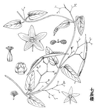 其根茎簇生,多数细长。根圆柱形,表面黄白色或淡黄色,稍皱缩。质脆,易折断,断面黄白色。气香,味辛辣麻。 七层楼属多年生缠绕藤本。具乳汁;根须状,黄白色;全株无毛,茎纤细,分枝多。叶对生;叶柄长约5mm;叶片卵状披针形,长3-5cm,宽1-2.5cm,先端渐尖或急尖,基部心形,上面深绿色,下面淡绿色,密被小乳头状突起;侧脉3-5对。聚伞花序腋生或腋外生,比叶为长;花淡紫红色,小;花萼裂片5,内面基部有5个腺体;花冠辐状,裂片卵形,副花冠5裂,贴生于合蕊冠基部,花药菱状四方形;花粉块每室1个,近球形,平展;子房无毛,由2枚离生心皮组成;柱头盘状五角形。蓇葖果双生,线状披针形,叉开成直线,长达5cm。种子近卵形,棕褐色,先端具长约2cm的白色绢质种毛。花期5-9月,果期8-12月。 |