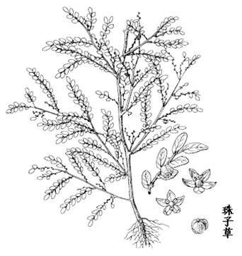 珠子草是一年生直立草本,高25-50cm。茎无毛,略带褐红色,通常自中上部分枝。单叶互生;叶柄极短;托叶披针形,长约1mm,膜质透明;叶片纸质,长圆形,长5-8mm,宽2-4.5mm,先端钝圆或近截平,或具不明显的锐尖头;侧脉5-6对。通常雌、雄花双生于每一叶腋内,或只有1朵雌花;雄花花梗长约1mm,萼片5,顶端急尖,腺体5,雄蕊3,花丝合生;雌花花梗长1-1.5mm,萼片不相等,膜质,边缘略带白黄色,子房球形,花柱分离,顶端2裂,裂片外弯;花盘分裂成三角形的薄片。蒴果直径1-1.5mm,褐红色,开裂成3枚分果爿,轴柱及花萼均宿存;种子具小颗粒状纵条纹。花、果期1-10月。 |