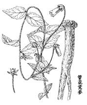 本种与前三种的区别在于:茎不缠绕,多攀援或蔓生状。叶柄较短,长5mm以下。花萼贴生于子房中部,裂片阔卵形,长1.2mm,宽约8mm,长不及花冠的一半;花冠管状;花丝被毛,花药龙骨状。花、果期7-10月。 5、球花党参的根肥大,长20-45cm,直径1-3cm。表面有皱缩的纵沟,常扭曲,上部有密环纹,并自中部向上至根头部渐细,习称“蛇头”、“蚯蚓头”;根茎具多数细小的茎痕或芽痕。断面角质样,皮部与木部相接处有一暗棕色环,木部约占根直径的1/2,具辐射状排列的细小裂隙。具特异臭气。 本种与前四种的区别在于:叶片较小,长宽均在3cm以下。花萼贴生至子房先端,有刺毛,裂片卵圆形或菱状卵圆形,裂片间弯缺宽钝,有锯齿及刺毛;花冠球状钟形,黄色,而先端带深红紫色。花、果期7-10月。 6、灰毛党参的根下部有的分叉。断面略显粉性,可见针晶样亮点。具特异气味。