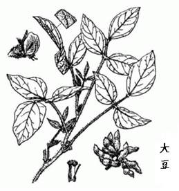 大豆一年生直立草本,高60-180cm。茎粗壮,密生褐色长硬毛。叶柄长,密生黄色长硬毛;托叶小,披针形;三出复叶,顶生小叶菱状卵形,长7-13cm,宽3-6cm,先端渐尖,基部宽楔形或圆形,两面均有白色长柔毛,侧生小叶较小,斜卵形;叶轴及小叶柄密生黄色长硬毛。总状花序腋生;苞片及小苞片披针形,有毛;花萼钟状,萼齿5,披针形,下面1齿最长,均密被白色长柔毛;花冠小,白色或淡紫色,稍较萼长;旗瓣先端微凹,翼瓣具1耳,龙骨瓣镰形;雄蕊10,二体;子房线形,被毛。荚果带状长圆形,略弯,下垂,黄绿色,密生黄色长硬毛。种子2-5颗,黄绿色或黑色,卵形至近球形,长约1cm。花期6-7月,果期8-10月。 |