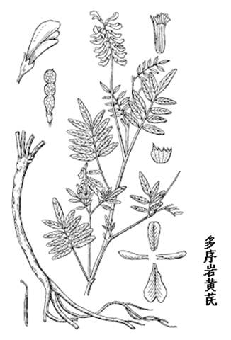 多序岩黄芪属多年生草本,高达1.5m。主根粗长,圆柱形,外皮红棕色,长10-50cm。叶互生;叶柄长;托叶披针形,基部连合;奇数羽状复叶,长达15cm;小叶7-25,叶柄基部甚短;叶片长圆状卵形,长1-3.5cm,宽5-11mm,先端近平截或微凹,基部宽楔形,全缘,上面无毛,下面中脉被长柔毛。总状花序腋生,长5-8cm,有花20-25,花梗丝状,长2-3mm,被长柔毛;花萼斜钟形,被短毛,最下面1个萼齿较其余4齿长大;蝶形花冠,淡黄色,长约1cm;雄蕊10,9合1离,子房狭长形,具柄。荚果扁平,串珠状,有3-5节,边缘具窄翅,表面有稀疏网纹及短柔毛,每节有椭圆形种子1颗。花期6-8月,果期7-9月。 |