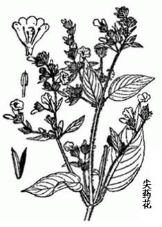 尖药花属多年生草本,高达1m。植株各部多少被灰白色绵毛。叶对生;具柄;叶片椭圆形至椭圆状长圆形,长5-12mm,先端尖,基部近圆形至心形,边圆具钝齿。花3-8朵成一簇,有间距地生于圆锥花序的分枝上,圆锥花序长达30cm;苞片、小苞片和花萼裂片均条形,长约7mm;花冠淡紫色,长约2.5cm,漏斗状钟形,外面无毛,里面近喉部有2行柔毛,裂片5,近相等;雄蕊二强,花丝基部有膜相连,2短雄蕊之间有一退化雄蕊残迹,花药药隔顶端有小尖头。蒴果长约1cm,有微毛。有种子6颗。 |