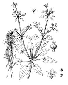 茜草属多年生攀援草本。根数条至数十条丛生,外皮紫红色或橙红色。茎四棱形,棱上生多数倒生的小刺。叶四片轮生,具长柄;叶片形状变化较大,卵形、三角状卵形、宽卵形至窄卵形,长2-6cm,宽1-4cm,先端通常急尖,基部心形,上面粗糙,下面沿中脉及叶柄均有倒刺,全缘,基出脉5。聚伞花序圆锥状,腋生及顶生;花小,黄白色,5数;花萼不明显;花冠辐状,直径约4mm,5裂,裂片卵状三角形,先端急尖;雄蕊5,着生在花冠管上;子房下位,2室,无毛。浆果球形,直径5-6mm,红色后转为黑色。花期6-9月,果期8-10月。 |