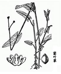 箭叶蓼属一年生草本,长可达1m。茎细长,蔓延或半直立,四棱形,无毛,沿棱上具倒生钩刺。叶互生;叶柄长达2cm,柄上具3-4或l-2排钩刺;托叶鞘长5-10mm,膜质,无毛;叶片长卵状披针形,长5-10rm.宽1.5-2.5cm,先端锐尖或微钝,基部深凹缺,具卵状三角形的叶耳,无毛,仅沿下面中脉具钩刺,质稍薄。头状花序顶生,通常成对,花密集,但数目不多,花梗平滑无毛;苞片长卵形,锐尖;花 被5裂,白色或粉白色;雄蕊8;花柱3,分裂。瘦果三棱形,长约3mm,黑色。花期5-6月,果期6-9月。