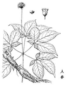 人参属多年生草本,高30-70cm。根肥大,肉质,圆柱形或纺锤形,末端多分歧,外皮淡黄色。叶为掌状复叶,具长柄;轮生叶的数目依生长年限而不同,一般1年生者1片三出复叶,2年生者1片五出复叶,3年生者2片五出复叶,以后每年递增1片复叶,最多可达6片复叶;小叶5,偶有7片;小叶柄长1-3cm;小叶片披针形或卵形,下方2片小叶较小,长2-4cm,宽1-1.5cm,上部3小叶长4.5-15cm,宽2.2-4cm,先端渐尖,基部楔形,边缘具细锯齿,上面绿色,沿叶脉有稀疏细刚毛,下面无毛。伞形花序单一顶生,总花梗长15-25cm,每花序有10-80多朵花,集成圆球形;花小,直径2-3mm;花萼绿色,5齿裂;花瓣5,淡黄绿色,卵形;雄蕊5,花丝甚短;子房下位,花柱2,基部合生,上部分离。果实为核果状浆果,扁球形,直径5-9mm,多数,集成头状,成熟时呈鲜红色,种子2颗,乳白色,直径4-5mm,扁平圆卵形,一侧平截。花期5-6月,果期6-9月。 |