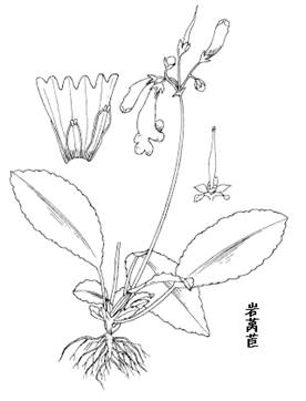 岩莴苣属多年生草本。根状茎长0.8-3cm。叶均基生;叶柄长2-9cm,无毛或有疏短毛;叶片革质,狭倒卵形、倒卵形或椭圆形,长1-10cm,宽1-6cm,先端圆钝,基部楔形,边缘具波状牙齿或小牙齿,两面无毛,叶脉不明显。聚伞花序2次分枝,每花序具1-4花;花序梗长8-17cm,无毛或被疏柔毛;苞片小,条形;花萼5深裂,裂片披针形;花冠蓝紫色,漏斗形,一侧膨胀,长约5cm,外面疏被短柔毛或无毛,内面具紫褐、黄色斑纹,檐部二唇形,上唇2裂,下唇3裂;能育雄蕊4,花药成对连着,花丝疏被腺状短柔毛;花盘环状,边缘波状;子房狭长圆形,长约1.2cm,花柱长1.5-2mm,柱头2,长圆形。蒴果倒披针形,长3.4-7cm。种子小,多数。花期10月,果期1月。 |