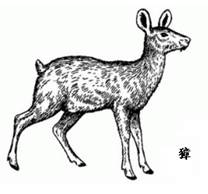 獐属小型鹿类,外表比麝大,重约15kg,体长约1m,四肢粗壮发达,尾甚短,几被臀部的毛所遮盖。雌雄均无角,雄性獠牙显露,侧扁,向下延伸,突出口外。耳中等大,基部有两条软骨质的脊突,顶端较尖。眼前方有狭袋形的眶下腺。鼠蹊部有一对鼠蹊腺,没有跗腺和脚腺。体毛多棕黄色,浓密粗长。体侧及腰部冬毛长达40mm,呈波形弯曲。幼兽身上有纵行排列的白色斑点。 |