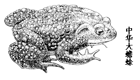1、中华大蟾蜍的体长一般在10cm以上,体粗壮,头宽大于头长,吻端圆,吻棱显著;鼻孔近吻端;眼间距大于鼻间;鼓膜明显,无犁骨齿,上下颌亦无齿。前肢长而粗壮,指、趾略扁,指侧微有缘膜而无蹼,指长顺序3、1、4、2,指关节下瘤多成对,掌突2,外侧者大。后肢粗壮而短,胫跗关节前达肩部,左右跟部不相遇,趾侧有缘膜,蹼尚发达,内跖变形长而大,外跖突小而圆。皮肤极粗糙,头顶部较平滑,两侧有大而长的耳后腺,其余部分满布大小不等的圆形瘰疣,排列较规则的为头后之瘰疣,斜行排列几与耳后腺平行。此外,沿体侧之瘰疣排列亦较规则,胫部之瘰疣更大,个别标本有不明显之跗褶,腹面皮肤不光滑,有小疣。颜色变异颇大,生殖季节雄性背面多为黑绿色,体侧有浅色的斑纹;雌性背面色较浅,瘰疣乳黄色,有时自眼后沿体侧有斜行之黑色纵斑,腹面乳黄色,有棕色或黑色细花纹。雄性个体较小,内侧三指有黑色婚垫,无声囊。