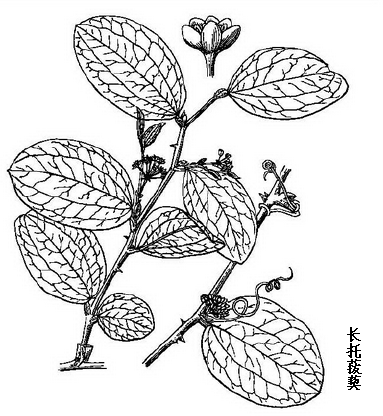 长托菝葜属攀援灌木。茎与枝条多少具纵条纹,疏生刺。叶互生;叶柄长5-25cm,约占全长的1/2-3/4具鞘,通常只有少数叶柄具卷须,脱落点位于鞘上方;叶片厚革质至坚纸质,椭圆形、卵状椭圆形至长圆形,长3-16cm,宽1.5-9cm,下面通常苍白色,极少绿色,干后灰绿黄色或暗绿色。伞形花序生于叶尚幼嫩的小枝上;总花梗长1-2.5cm,偶有关节,花序托常延长而使花序多少呈总状;花单性,雌雄异株;花被片6,黄绿色或白色;雄花外轮被片长4-8mm,宽2-3mm,内花被片稍狭,雄蕊6;雌花比雄花小,花被片3-6mm,具6枚退化雄蕊,子房3室,柱头3裂。浆果球形,直径8-15mm,熟时红色。花期3-4月,果期10-11月。