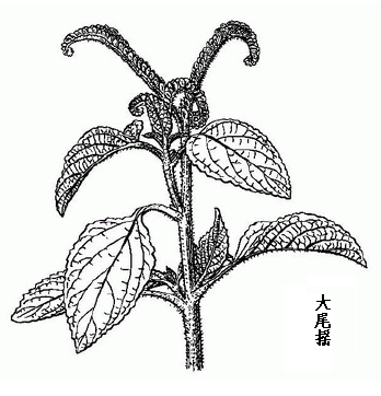 大尾摇属一年生草本,高15-60cm。根圆柱形,干时黄褐色。茎直立,粗壮,多分枝,被糙伏毛。叶互生,稀近对生;叶柄长2-5cm;叶片卵形椭圆形,长4-10cm,宽2-4cm,先端短尖或渐尖,基部圆形或截形,下延至叶柄,边缘稍有锯齿或略呈波状,两面疏生短糙毛。蝎尾状聚伞花序,长5-20cm,细长弯曲,单一,不分枝,顶生或与叶对生,无苞片;花小密集,呈2列排列于花序轴的一侧;花萼5深裂,裂片披针形,被糙伏毛;花冠浅蓝色或蓝紫色,稀白色,高脚碟状,长3-5mm,先端5浅裂,裂片近圆形,扩展,喉部光滑,无附属物;雄蕊5,内藏,着生于花冠简基部;子房小,花柱与柱头极短,柱头阔圆锥体形,先端平截。核果卵形,长4-5mm,有纵肋,2深裂,每裂瓣分成2枚各具单颗种子的分核。花期4-7月,果期8-10月。