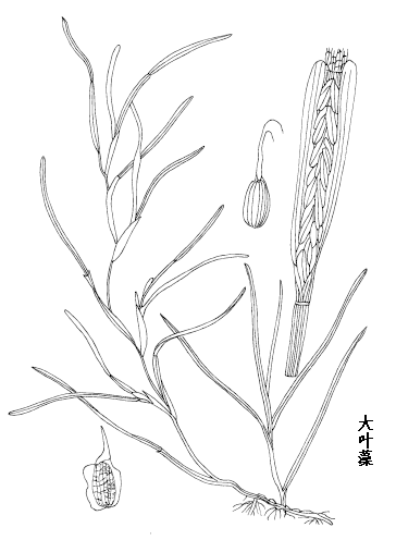 大叶藻属多年生沉水草本。有根状匍匐茎,节上生须根;茎细,有疏分枝。叶互生;叶长条形,长30-50cm,宽3-5mm,先端钝圆,全缘,有5脉,稀7-11脉;托叶膜质,与叶基分离。肉穗花序初时包于佛焰苞内,花序轴扁平,叶状,长3-4cm,贴生于佛焰苞上;花小,雌雄花交互排列于花序轴两侧,无花被;雄花仅1花药;雌花仅1雌蕊,柱头2。瘦果椭圆形至卵形,长2.5-4mm,有纵棱。种子椭圆形或卵形,亦有纵棱纹。花、果期4-7月。
