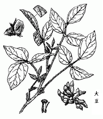 大豆是一年生直立草本,高60-180cm。茎粗壮,密生褐色长硬毛。叶柄长,密生黄色长硬毛;托叶小,披针形;三出复叶,顶生小叶菱状卵形,长7-13cm,宽3-6cm,先端渐尖,基部宽楔形或圆形,两面均有白色长柔毛,侧生小叶较小,斜卵形;叶轴及小叶柄密生黄色长硬毛。总状花序腋生;苞片及小苞片披针形,有毛;花萼钟状,萼齿5,披针形,下面1齿最长,均密被白色长柔毛;花冠小,白色或淡紫色,稍较萼长;旗瓣先端微凹,翼瓣具1耳,龙骨瓣镰形;雄蕊10,二体;子房线形,被毛。荚果带状长圆形,略弯,下垂,黄绿色,密生黄色长硬毛。种子2-5颗,黄绿色或黑色,卵形至近球形,长约1cm。花期6-7月,果期8-10月。