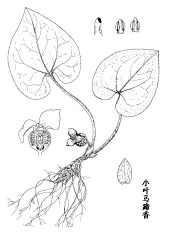 2、小叶马蹄香的根茎短。根直径1-2mm,灰黄色,断面灰白色。完整叶展开后呈心形、卵状心形,长3-6cm,宽3.5-7.5cm,先端急尖或钝,基部心形,上面主脉两侧时有云斑,脉上及边缘有短毛;叶柄长3-15cm。气芳香,味麻辣,略麻舌。