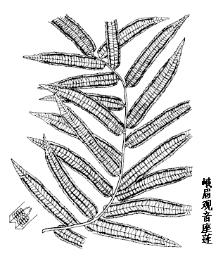 3、中华观音座莲的形态与峨眉观音座莲基本相似,主要区别:本种小羽片远较宽,彼此接近,几无柄,边缘通体有尖锯齿。