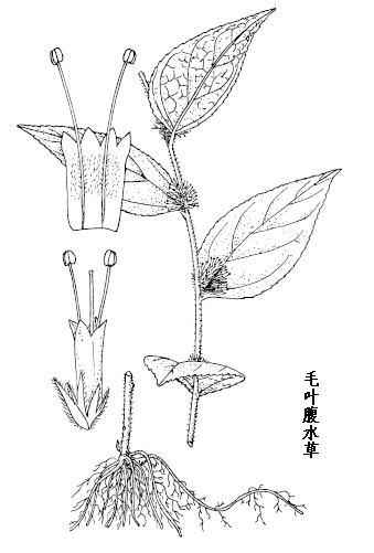 2. 毛叶腹水草 多年生草本,高可达2m。除花冠外全体密被多细胞柔毛。叶片卵状菱形,长7-12cm,宽3-7cm,两面密被棕色腺毛。花序头状,腋生,长1-1.5cm;近无梗;苞片披针形;花萼5深裂,裂片钻形,稍不等长,短于苞片,同样被毛;花冠紫色或紫蓝色,长6-7mm,4裂,裂片三角形,近相等,长1-1.5mm,筒部内面上端被长柔毛;雄蕊2,强烈伸出,花药长1.2-1.5mm。蒴果卵形,长约2.5mm。种子黑色,球形,直径约0.3mm。花期6-8月。
