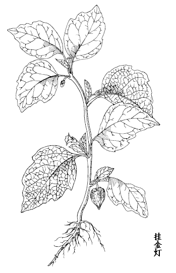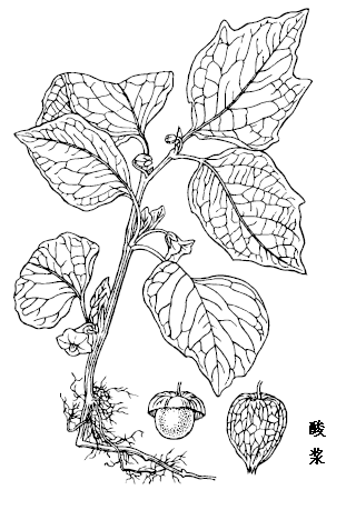 1. 酸浆属多年生草本,基部常匍匐生根。茎高约40-80cm,基部略带木质。叶互生,常2枚生于一节;叶柄长约1-3cm;叶片长卵形至阔卵形,长5-15cm,宽2-8cm,先端渐尖,基部不对称狭楔形,下延至叶柄,全缘而波状或有粗牙齿,两面具柔毛,沿叶脉亦有短硬毛。花单生于叶腋,花梗长6-16mm,开花时直立,后来向下弯曲,密生柔毛而果时也不脱落;花萼阔钟状,密生柔毛,5裂,萼齿三角形,花后萼筒膨大,变为橙红或深红色,呈灯笼状包被浆果;花冠辐状,白色,5裂,裂片开展,阔而短,先端骤然狭窄成三角形尖头,外有短柔毛;雄蕊5,花药淡黄绿色;子房上位,卵球形,2室。浆果球状,橙红色,直径10-15mm,柔软多汁。种子肾形,淡黄色。花期5-9月,果期6-10月。