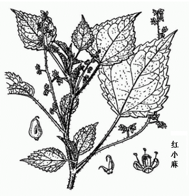 红小麻属一年生草本。茎高30-120cm,全草有刺毛。叶长5-15cm,叶柄与叶片等长;托叶2裂;叶片心状卵形,先端锐尖,基部心形或楔形,具粗锯齿缘;基出脉3条,质地柔软。圆锥花序腋生,常长于叶柄,花单性,雄花花被4-5,卵状披针形,雄蕊4-5;雌花花被杯状,4裂或齿状,有柄,子房斜形,花柱为不整齐3裂。瘦果稍扁。花期7-8月,果期8-9月。