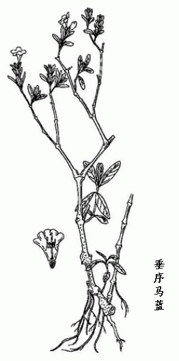 垂序马蓝属多年生灌木状草本,高60-80cm。茎丛生,呈四棱形,靠地的节上生不定根,节间基部肿胀;上部多分枝。叶对生;叶柄短或近无柄;叶片披针形,长3-4cm,宽0.7-1cm,先端钝尖,基部狭楔形,两面均无毛,边缘有疏钝锯齿。短穗状花序由枝顶叶腋抽出;花淡紫色,直径约1.2cm;萼片5;花冠漏斗状,下部细长成筒,略弯,上部5裂片,先端圆形;雄蕊二强,着生于冠管上,花丝基部有膜相连,有1退化雄蕊残迹。蒴果长7-10mm。种子4颗,有微毛。花期6-7月。