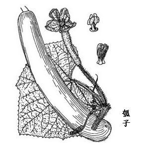 瓠子属一年生攀援草本。茎、枝具沟纹,被粘质长柔毛,老后渐脱落。叶互生;叶柄长达20cm,被毛;顶端有2腺体;卷须纤细,上部分2歧;叶片卵状心形或肾状卵形,长、宽均10-35cm,不分裂或稍浅裂,边缘有小齿。花单性,雌雄同株;花白色。雄花花萼筒漏斗状,裂片披针形,花冠裂片皱波状;雄蕊3,药室折曲;雌花花萼和花冠似雄花;子房圆柱状,密被粘质长柔毛。果实粗细均匀而呈圆柱状,稍弯曲,长60-80cm,绿白色,果肉白色。花期7-8月,果实8-9月。