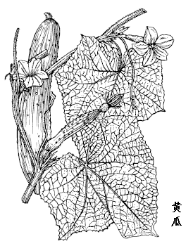 黄瓜皮为葫芦科植物黄瓜的果皮。本品呈不规则卷筒状,厚1-2mm。外表面黄褐色,上有深褐色疣状突起及黄白色或黄色网状花纹;内表面黄白色,有皱纹。质轻而柔韧。气清香,味淡。 黄瓜属一年生蔓生草本。茎枝伸长,有纵沟及棱,被白色硬糙毛。卷须细,不分枝,具白色柔毛。单叶互生;叶柄稍粗糙;叶片三角状宽卵形,膜质,长、宽均12-18cm,两面甚粗糙,掌状3-5裂,裂片三角形并具锯齿,有时边缘具缘毛。花单性,雌雄同株;雄花,常数朵簇生于叶腋,花梗细,被柔毛,花萼简狭钟状圆筒形,密被白色长柔毛,花萼裂片钻形,开展与花萼近等长;花冠黄白色,长约2cm,花冠裂片长圆状披针形,急尖;雄蕊3,花丝近无;雌花单生,或稀簇生,花梗粗壮,被柔毛。子房纺锤形,柱头3。果实长圆形或圆柱形,长10-30(-50)cm,熟时黄绿色,表面粗糙,具有刺尖的瘤状凸起,极稀近于平滑。种子小,狭卵形,白色,无边缘。花、果期为夏、秋季。