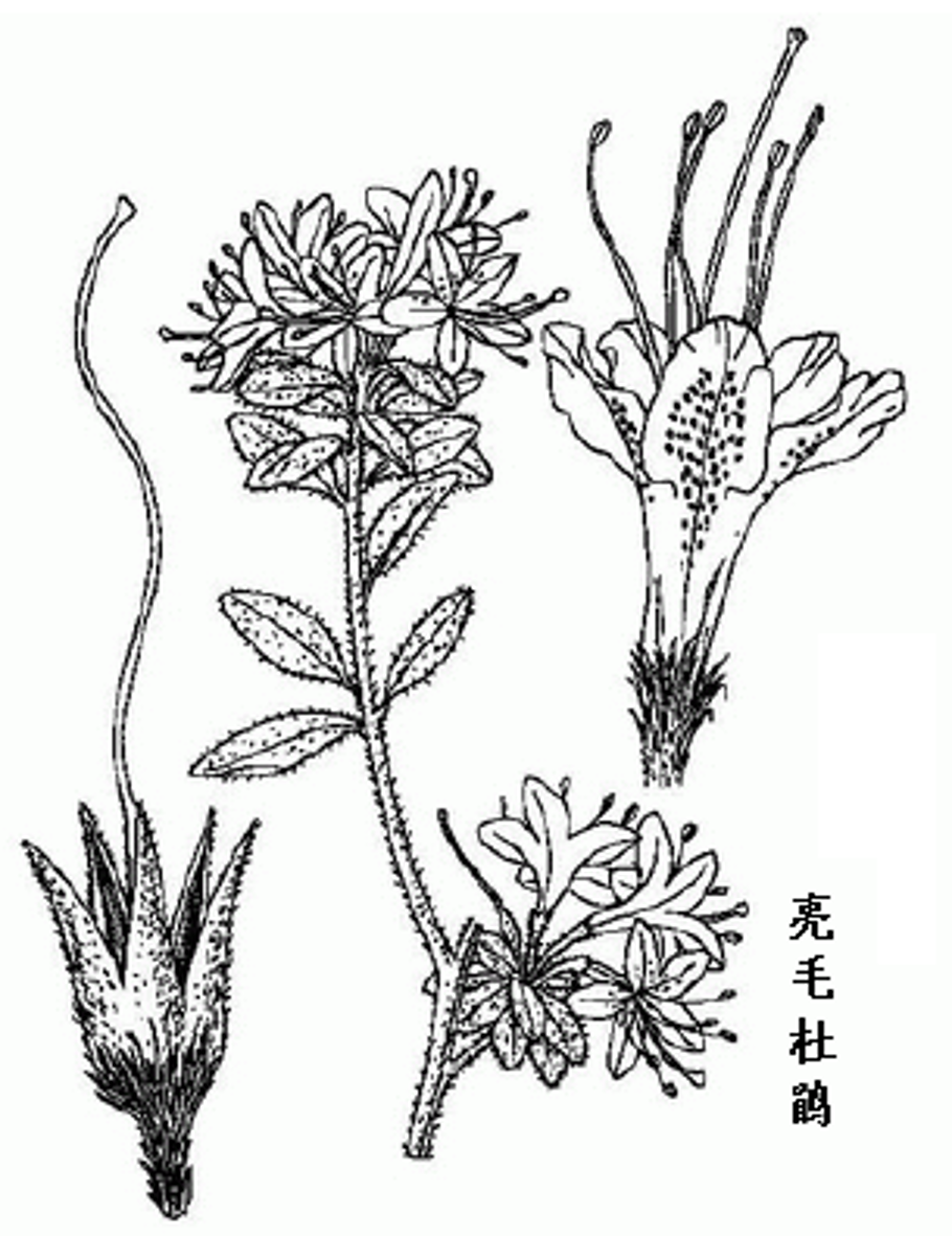 酒瓶花为杜鹃花科植物亮毛杜鹃的根和叶。 亮毛杜鹃属常绿小灌木,高0.5-2m。小枝细而多,淡褐色,密被红棕色伏毛。单叶互生;密集枝顶,叶柄短,长2-5mm,被褐色糙伏毛。叶片革质,椭圆形、椭圆状卵形或长卵状披针形,长1-4.5cm,宽0.5-2cm,先端锐尖、短渐尖或渐尖,基部短楔形,全缘,表面深绿色,伏生疏长毛,背面淡绿色,散生红棕色扁平伏毛,中脉在两面稍明显,侧脉和网脉均不明显。花3-6朵,生于枝顶叶腋,形成伞形或总状花序;花便长3-6mm,有光亮的红棕色细毛;花萼较小,5裂或不裂,长1-4mm,具红棕色细毛;花冠漏斗形,略呈两侧对称,淡紫红色、粉红色,或鲜紫色,5裂,裂片开展,上方3裂片内有深红色斑点;雄蕊5枚,较花冠长,花丝下部被微柔毛,花药顶孔开裂;雌蕊1,子房5室,密被红棕色长糙毛,花柱细长,无毛或基部有毛。蒴果小,卵形,长4-9mm,外面密被红棕色糙伏毛,花柱宿存,熟时5裂。花期3-5月,果期6-7月。