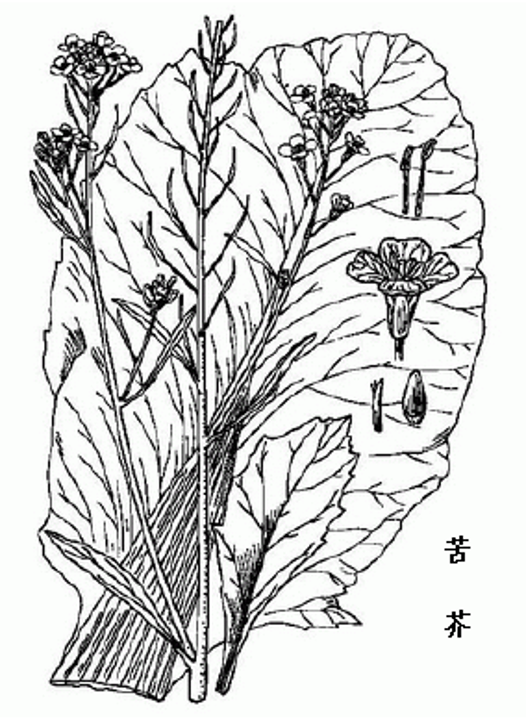 苦芥为十字花科植物苦芥的基生叶和种子。 苦芥属一年生或二年生草本,植株高30-100cm。主根粗壮,圆锥形,有多数须根。茎直立,多分枝,无毛或基部有细刚毛。基生叶多数,叶片宽倒卵形,长35-60cm,宽18-25cm,先端圆形,基部楔形而渐狭成柄,边缘有大小不等的牙齿和重锯齿,中脉扁平而宽;叶柄肉质肥厚,有小裂片;茎中部叶长圆形或倒宽披针形,无柄;茎上部叶宽线形,无柄或具短柄,叶片均具粉霜。总状花序顶生,具花多数;萼片4,边缘膜质,外侧2枚基部略呈囊状;花瓣4,鲜黄色,倒卵形,具脉纹,长8-10mm,基部具爪;雄蕊6,4长2短,长雄蕊长7-7.5mm,短雄蕊长6-6.5mm;雌蕊1,子房圆柱形,柱头头状。长角果圆柱形,长3-4cm,先端具喙。种子球形。花期3-4月,果期5-6月。