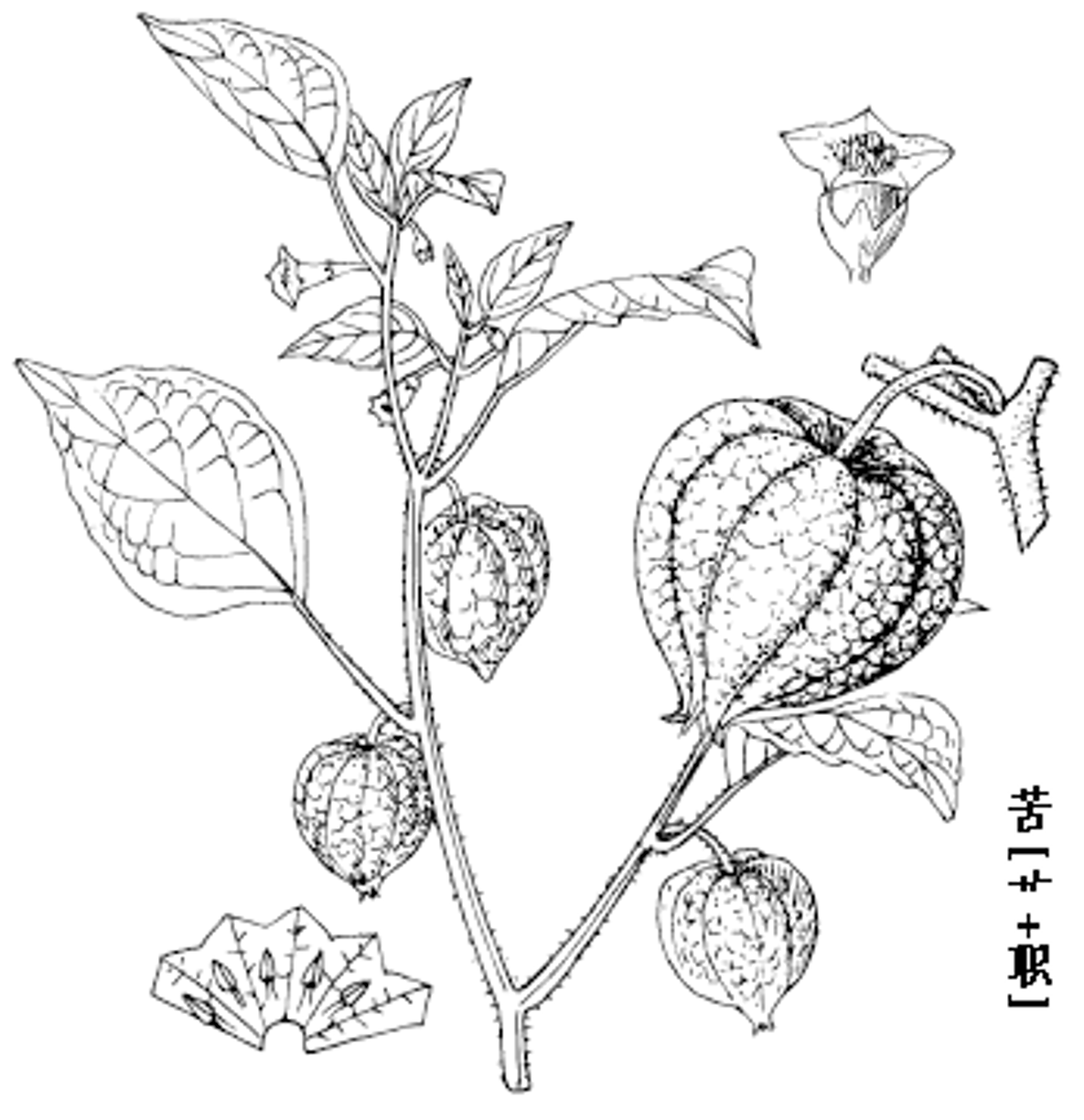 苦[艹+职]为茄科植物苦[艹+职]的全草。茎有分枝,具细柔毛或近光滑,叶互生,黄绿色,多皱缩或脱落,完整者卵形,长3-6cm,宽2-4cm(用水泡开后展平),先端渐尖,基部偏斜,全缘或有疏锯齿,厚纸质;叶柄1-3cm。花淡黄棕色,钟形,先端5裂。有的可见果实,球形,橙红色,外包淡绿黄色膨大的宿萼,长约2.5cm,有5条较深的纵棱。气微,味苦。以全草幼嫩、色黄绿、带宿萼多者为佳。 苦[艹+职]属一年生草本,被疏短柔毛或近无毛,高30-50cm。茎多分枝,分枝纤细。叶柄长1-5cm;叶片卵形至卵状椭圆形,长3-6cm,宽2-4cm,先端渐尖,基部楔形,全缘或有不等大牙齿,两面近无毛。花单生于叶腋,花梗纤细;花萼钟状,5中裂,裂片披针形,花冠淡黄色,5浅裂,喉部常有紫斑,长4-6mm,直径6-8mm;雄蕊5,花药蓝紫色或有时黄色,长1.5mm。浆果球形、直径1.2cm,包藏于宿萼之内。宿萼膀胱状,绿色,具棱,棱脊上疏被短柔毛,网脉明显。种子圆盘状,长约2mm。花、果期5-12月。