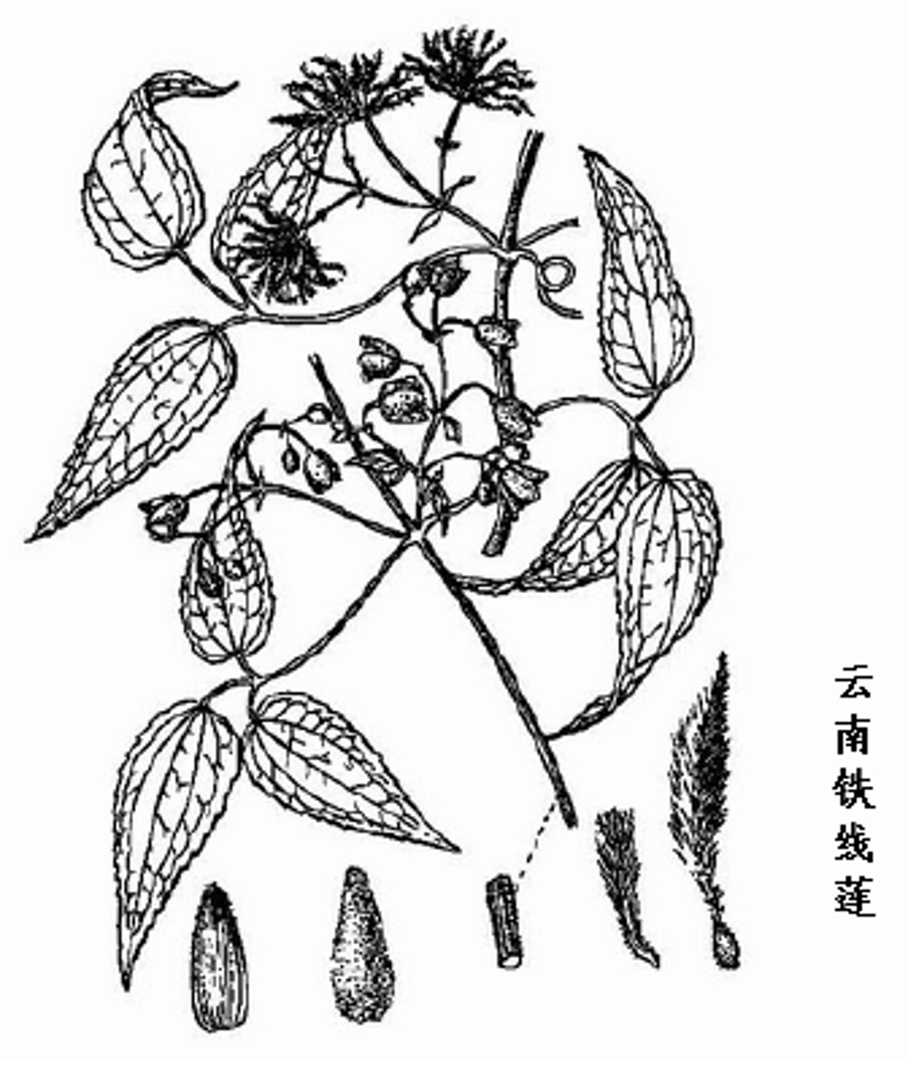 辣木通为毛莨科植物云南铁线莲的藤茎或全株。茎藤缠绕或成段,圆柱形,表面棕褐色,上部草质,中、下部木质,质硬,断面木部占大部分。叶对生,叶柄长,三出复叶;小叶宽披针形或卵状披针形,先端尾状渐尖,基部圆形,边缘有整齐的锯齿,质脆,易碎。气微,味辛微苦。 云南铁线莲属本质藤本。茎褐色,幼时被柔毛,后脱落无毛。叶对生,三出复叶;叶柄长3-5cm,被疏柔毛;小叶片卵状披针形或宽披针形,长5-10cm,宽1.5-4cm,先端尾状渐尖,基部圆形,边缘有整齐的锯齿,齿尖具细尖头,或有时全缘,上面或仅主脉有毛,下面被疏毛或近无毛,基出主脉3条,顶生小叶柄长1-3cm,侧生小叶柄长不到1cm,微被柔毛或近无毛。聚伞花序腑生,比叶短,3-7朵花,花序梗长1-3cm,被短柔毛,花序分枝处有一对披针形苞片,长1-2cm;花两性,钟状,直立,直径1.5cm,花梗长1-3cm;萼片4,卵圆形或狭卵形,长1.2-1.5cm,宽4-5mm,白色或淡黄色,先端钝尖,基部近圆形,外面及边缘被绒毛,内面无毛;花瓣无;雄蕊多数,长1.2-1.5cm,花丝线形,两侧生长柔毛,基部被短柔毛;心皮多数,被绢状毛。瘦果卵形,长2-3mm,被短柔毛,宿存花柱羽毛状,长2.2cm。花期11-12月,果期翌年4-5月。