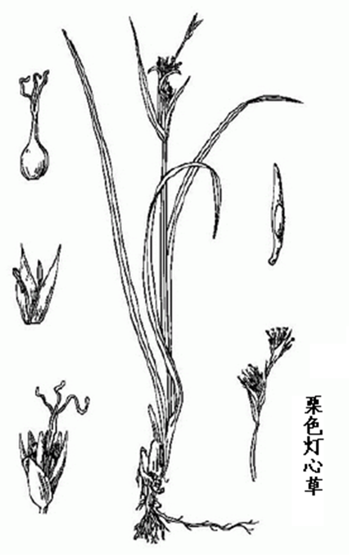 栗花灯心草为灯心草科植物栗色灯心草的全草。 栗色灯心草属多年生草本,高25-35cm。具长的根茎。秆直立,直径2-3mm,中空无髓。叶生于秆的中部以下,基生叶鞘质地薄弱,长1-2cm,松弛抱茎,叶耳不显着;叶片长5-10cm,宽3-4mm,常对折。花序球直径6-8mm,结果时长达1cm,通常由10个左右组成圆锥花序,分枝长达8cm,各被有叶状苞片,苞片膜质,披针形;花被片栗褐色,被针形,外轮长约5mm,内轮者长约4mm;雄蕊6,长为花被的1/2-2/3,花药黄色,长约1mm;雌蕊具长1.5mm的花柱,柱头线状,三分叉。蒴果长达6mm,直径约3mm,栗褐色,具3个角棱。种子长约1mm,两端各附长约1.2mm的尾状物。花、果期7-9月。