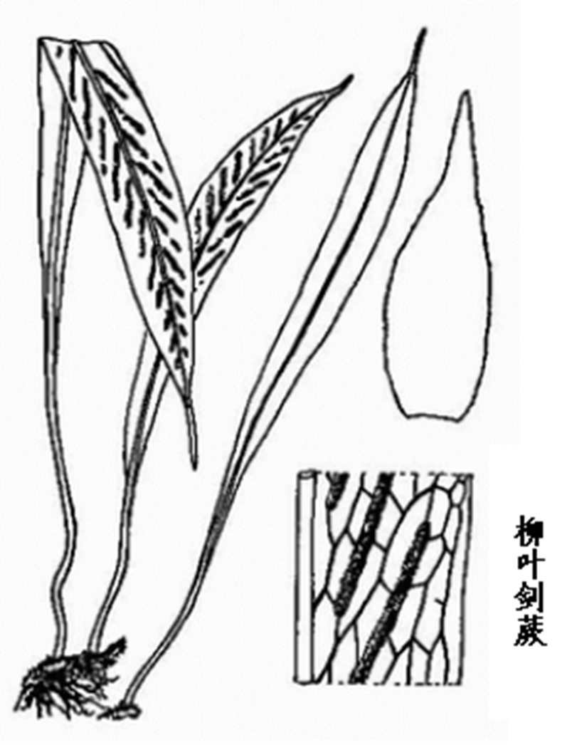 柳叶剑蕨为剑蕨科植物柳叶剑蕨的全草。 柳叶剑蕨的植株高15-35cm。根茎细弱,长而横走,密被棕褐色、卵状披针形鳞片。叶远生;叶柄长2-5cm,或近无柄,与叶片同色或下部稍带褐色,基部疏被卵状披针形鳞片,向上光滑;叶片近肉质,披针形,长12-30cm,中部宽1-2cm,有时可达3cm,先端长渐尖,向基部渐变狭,常下延,全缘,干后稍反卷;中脉上面平坦,下面隆起,不达顶端,小脉网状,无内藏小脉。孢子囊群线形,多少下陷叶肉,通常在10对以上,由中脉两侧各成1行;无囊群盖。