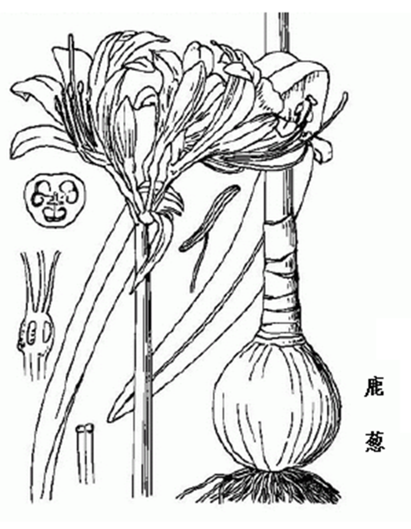 鹿葱为石蒜科植物鹿葱的鳞茎。 鹿葱属多年生草本。鳞茎卵形,直径4-5cm。秋季出叶,长约8cm,立即枯萎,第2年早春又抽叶;叶带状,宽约2cm,先端圆钝,绿色。花茎高50-70cm;总苞片2枚,披针形,长约6cm,宽约1.3cm;伞形花序有花4-8朵,淡紫红色;花被裂片倒披针形,长约7cm,宽约1.8cm,边缘基部微皱缩;花被管长约2cm;雄蕊与花被裂片近等长,花柱略伸出花被外。花期8月。