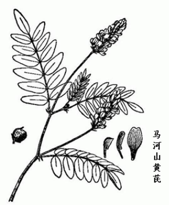 马河山黄芪为豆科植物马河山黄芪的全草。 马河山黄芪属多年生草本,高10-30cm。植株各部分有伏贴的短柔毛。茎直立,常有分枝。奇数羽状复叶,互生;托叶分离,披针形,长约7mm,宽约3mm,有毛;小叶13-19枚,椭圆形,长8-20mm,宽5-10mm,先端钝,基部圆,近于无柄,上面无毛,下面有平伏柔毛;叶轴有疏毛。总状花序腋生,短,有花15-40朵密集成圆柱状;花萼钟状,萼齿短,有黑色柔毛;花冠白色,旗瓣先端凹,基部无爪,翼瓣较龙骨瓣长,有爪;子房有柔毛,有短柄。荚果近球形,直径约3mm,有柔毛。花期6-7月,果期7-8月。