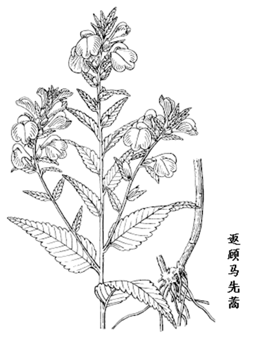 马先蒿为玄参科植物返顾马先蒿的根。 返顾马先蒿属多年生草本,高30-70cm。根多数丛生,细长而纤维状。茎常单生,直立,上部分枝,粗壮,中空,方形有棱。叶互生或对生;叶柄短,上部叶近无柄,无毛;叶片膜质至纸质;卵形至长圆状披针形,长2.5-5.5cm,宽1-2cm,先端渐窄,基部楔形或圆形,边缘有钝圆的重锯齿,两面无毛或有疏毛。花单生于茎枝顶端的叶腋中;无梗或有短梗;萼长卵圆形,膜质,前方深裂,齿仅2枚,宽三角形,全缘或略有齿,光滑或有微缘毛;花冠淡紫红色,长2-2.5cm,管长1.2-1.5cm,向右扭旋,上唇盔状,扭向右方,下唇大,有缘毛,3裂,中裂较小;雄蕊花丝前面一对有毛;花柱伸出喙端。蒴果斜长圆状披针形,长1-1.6cm。花期6-8月,果期7-9月。