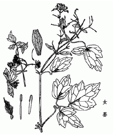 女萎为毛莨科植物女萎的藤茎、叶或根。茎类方形,长可达数米,缠绕或切段,直径1-5mm。表面灰绿色或棕绿色,通常有6条较明显的纵棱,被白色柔毛,质脆,易断,断面不平坦,木部黄白色,可见多数细导管孔,髓部疏松。叶对生,三出复叶,叶片多皱缩破碎,完整的叶片卵形或宽卵形,顶生小叶片较两侧小叶片大,常呈不明显的3浅裂,边缘有缺刻状粗锯齿或牙齿,暗绿色,两面有短柔毛。总叶柄长2-9cm,常扭曲。有的带有花果。气微,味微苦涩。